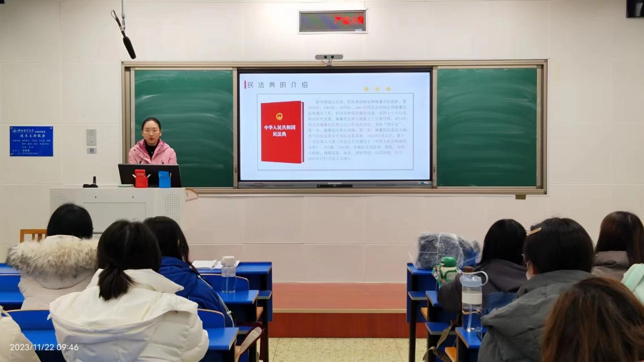 11月22日,肉漫屋 在B103教室开展了“美好生活,民法典相伴”校园普法活动,邀请校法制办宋妍妍老师做专题宣讲,21级物流管理专业全体学生参加。
