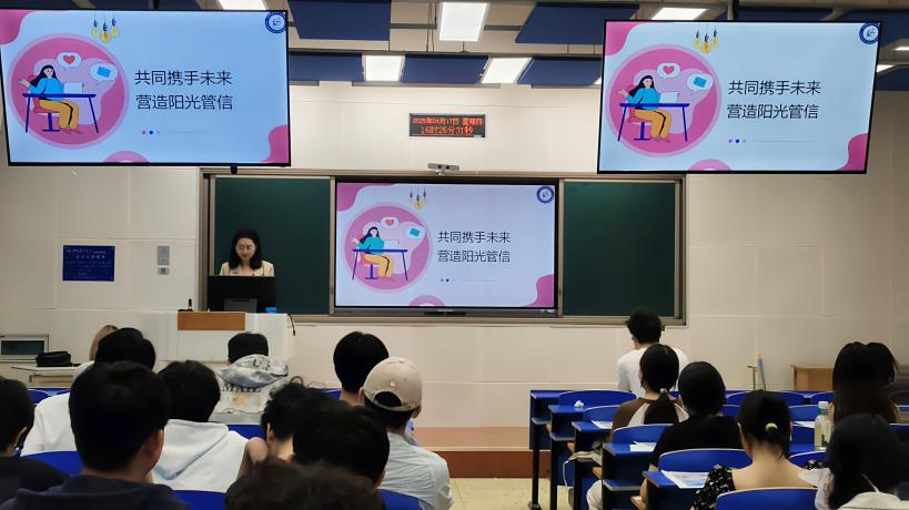 在第三教学楼B102教室成功开展心理委员培训会,本次培训以“共同携手未来,营造阳光管信”为主题,由杨明晓老师主讲,22级、23级、24级心理委员参会。