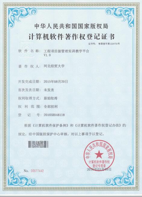 近日,由肉漫屋 与经济管理实验中心、教务处联合自行开发的实训教学平台:《工程项目级管理实训教学平台V1.0》获得由国家版权局颁发的计算机软件著作权登记证书(证书编号:2016SR048118)。