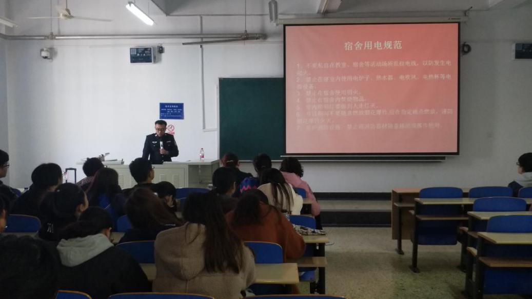 李云峰结合北京大兴新建村等多起火灾案例,向学生强调了消防安全的重要性,对防范火灾注意事项和火场逃生方法进行了详细讲解,并现场演示了灭火器的使用方法。张晓军就学生安全自护、网络购物诈骗和非法“校园贷”等各方面,进行了全方位的安全教育,要求学生们切实提高安全防范意识。