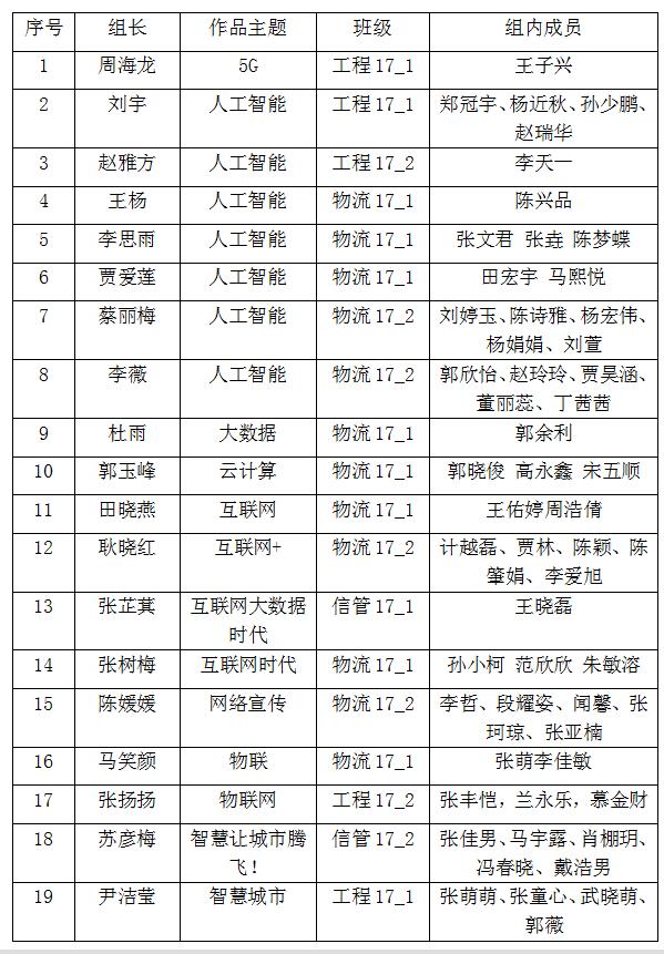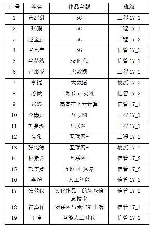 大赛主要包括互联网,物联网,云计算,大数据,人工智能,互联网+,移动互联网,5G,智联网和智慧城市等多个与新兴信息技术相关的主题,本次活动得到肉漫屋 2017届工程管理、物流管理和信息管理与信息系统三个专业新生的热烈欢迎,自2017年10月底开始报名后,共收到参赛作品123份,其中个人组作品82份,团队组作品41份,经学生评审团的初步筛选,分别从个人组和团体组筛选出19份参赛作品参加第二阶段的决赛,其中进入决赛阶段的名单附后。