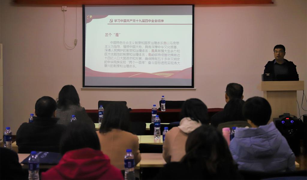 会前,高永芳传达了关于做好我校党的十九届四中全会精神宣讲安排的通知。学院向全体教职工发放了《党的十九届四中全会<决定>学习辅导百问》一书。宋智广向全体教职工传达了学校关于学习宣传贯彻党的十九届四中全会精神的要求,带领与会教师以原原本本学原文的方式共同学习了《中共中央关于坚持和完善中国特色社会主义制度、推进国家治理体系和治理能力现代化若干重大问题的决定》。