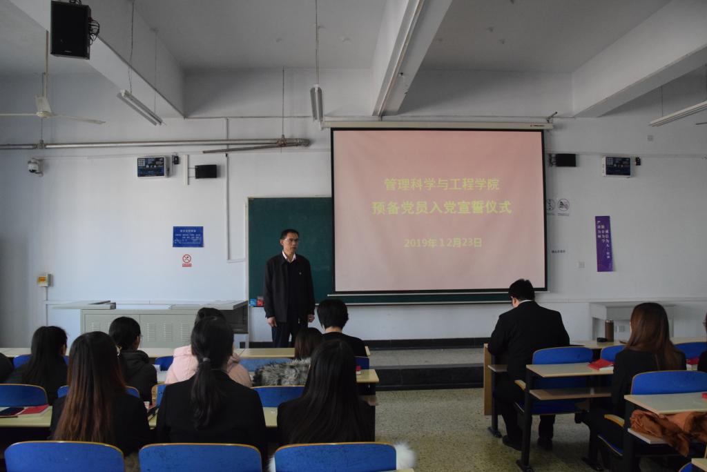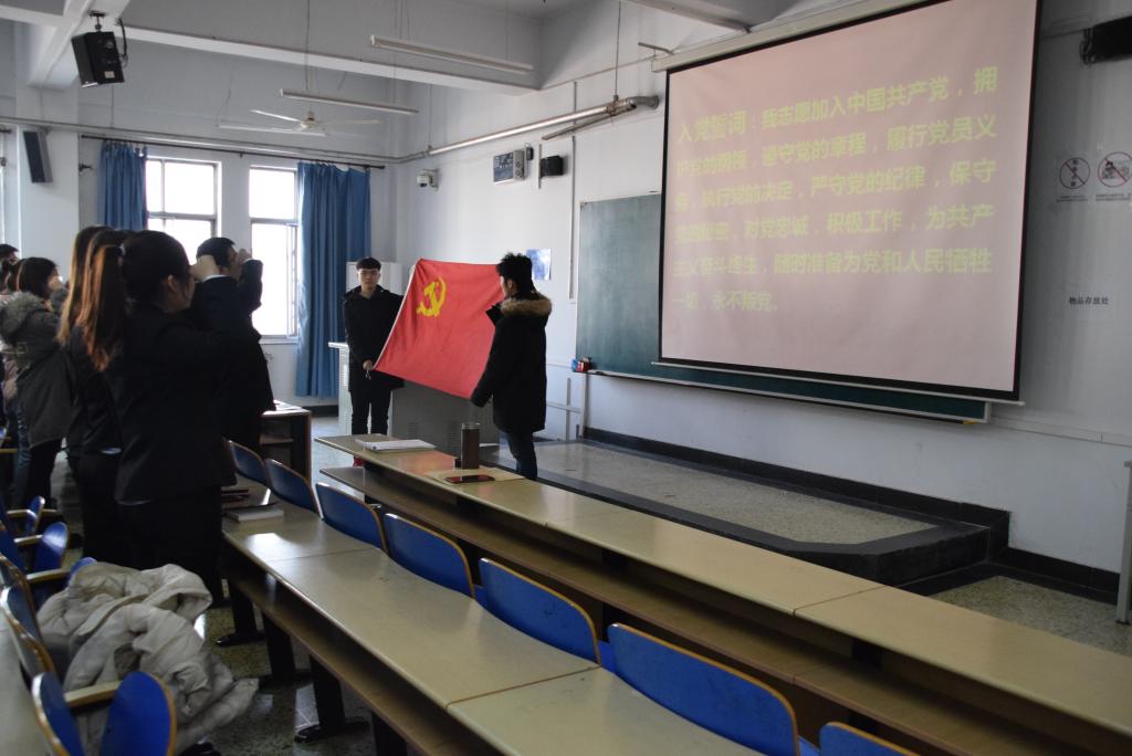 在A501教室举行预备党员入党宣誓仪式。仪式由学院党务办公室负责人宋智广主持,学院党委书记高永芳出席,学院第一学生党支部书记李淑菊、第二学生党支部书记王芳和全体预备党员参加。