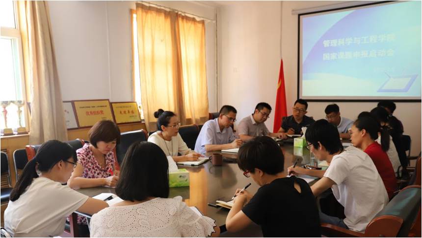 管理科学与工程学院国家课题申报启动会于2019年7月5日下午两点半在学院会议室召开。会议由院长祁红梅教授主持,学院党委书记高永芳同志、副院长李伟红教授及青年骨干教师参加。