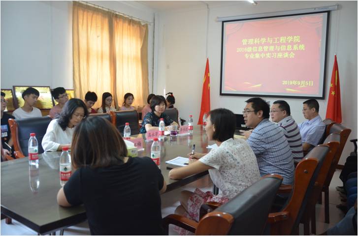 2019年9月5日,管理科学与工程学院2016级信息管理与信息系统专业集中实习座谈会在第三办公楼134会议室召开,参加此次会议的有学院党委书记高永芳、院长祁红梅、副院长李伟红、信息管理与信息系统系主任成岳鹏、辅导员李淑菊、专业指导老师以及16级信管专业学生。