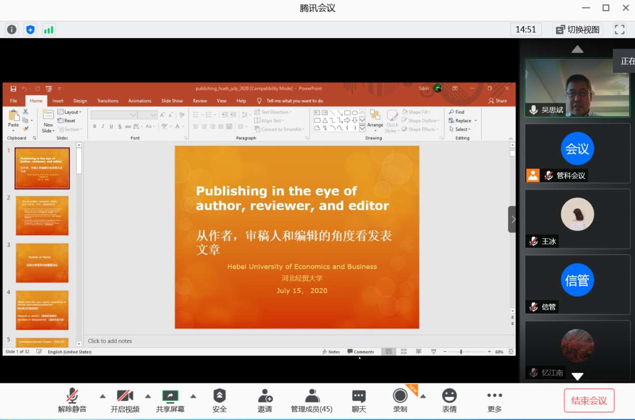 7月15日,美国德克萨斯大学吴思斌教授应肉漫屋 邀请,通过腾讯平台作了题为《从作者、审稿人、编辑的角度看发表文章》的学术讲座。讲座由院长祁红梅教授主持,学院教师、研究生、部分本科生以及其他学院教师在线聆听了此次讲座。
