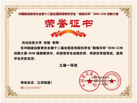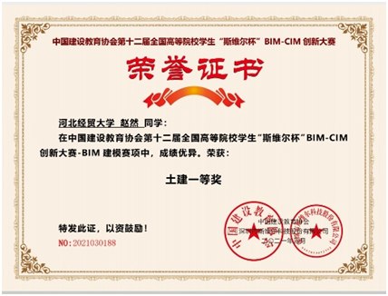 学生赵然在比赛中荣获BIM建模赛项土建一等奖。本届大赛由中国建设教育协会主办,包含BIM建模、专项应用、综合应用三个赛项,共400多所院校7000多名选手报名。按照大赛总体原则,在疫情总体防控环境下,比赛采用线上形式。