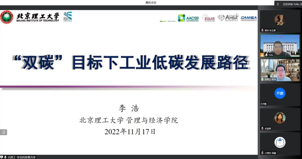 邀请北京理工大学管理与经济学院特别研究员、博士生导师李浩副教授及王玉昆博士作了题为“碳中和目标下工业低碳发展路径探究——基于上下耦合的Stars综合评估模型”的学术讲座。讲座由大数据管理与应用教研室张雪峰博士主持。