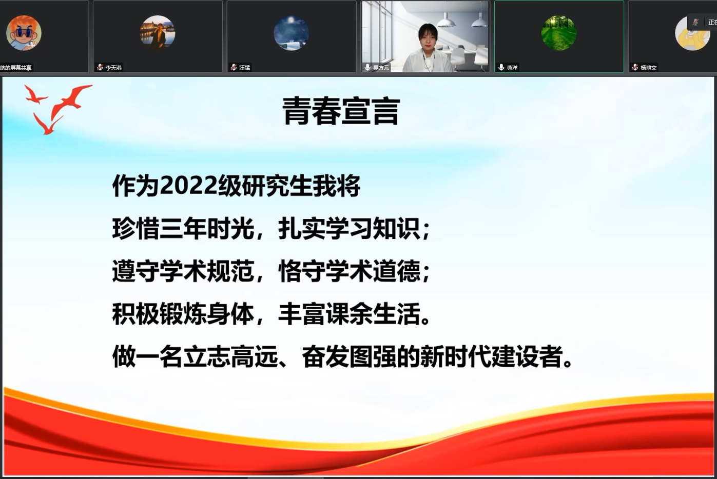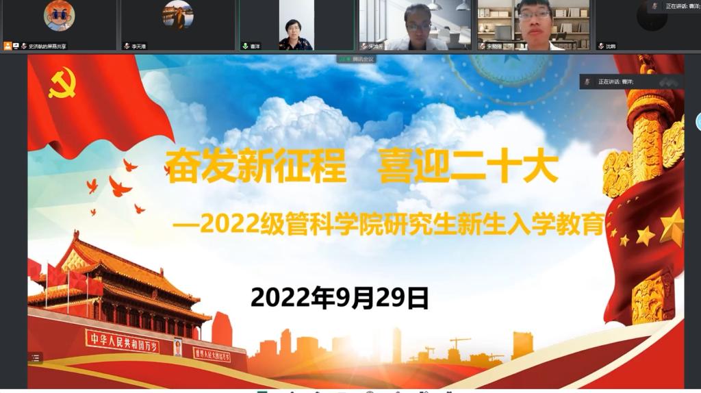 研究生学籍管理规定》,提醒学生遵守学校的各项规定、注意宿舍用电安全;“铸梦管科”新生相约模块主要由新生代表发言,分享了自己的感悟;“萌新知多少”知识抢答环节通过独特新颖的方式让新生了解了党史知识以及学院的基本情况;“传承红色基因”主题观影通过师生共同录制视频“习语播报”短片,让红色思想展现在师生的视野中。随后,参会辅导员就本次主题班会展开了热烈的讨论与交流。