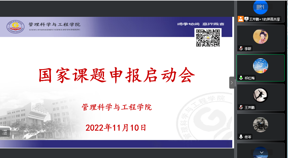 2022年11月10日,肉漫屋 通过腾讯会议召开了国家课题申报启动会,会议由院长祁红梅主持,副院长王芹鹏及全院教师参加。