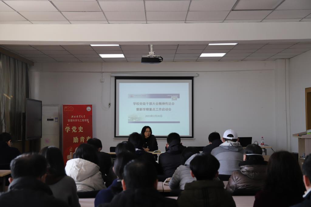 会上,祁红梅传达了刘兵书记和黄晟校长在全校处级干部大会上的讲话精神和2023年学校工作要点。她指出,今年学院重点工作与学校会议精神要保持高度一致,将围绕着学习贯彻党的二十大精神、全力争取博士学位授予权、迎接新一轮教育教学审核评估、提升打造中国式现代化河北教育场景过程中的经贸贡献、开展建校70周年纪念活动等5项重点工作和相关主要工作,立足学院现有基础和发展节奏,提前谋划部署各项任务,有重点、有步骤、有速度、有效果的工作开展。