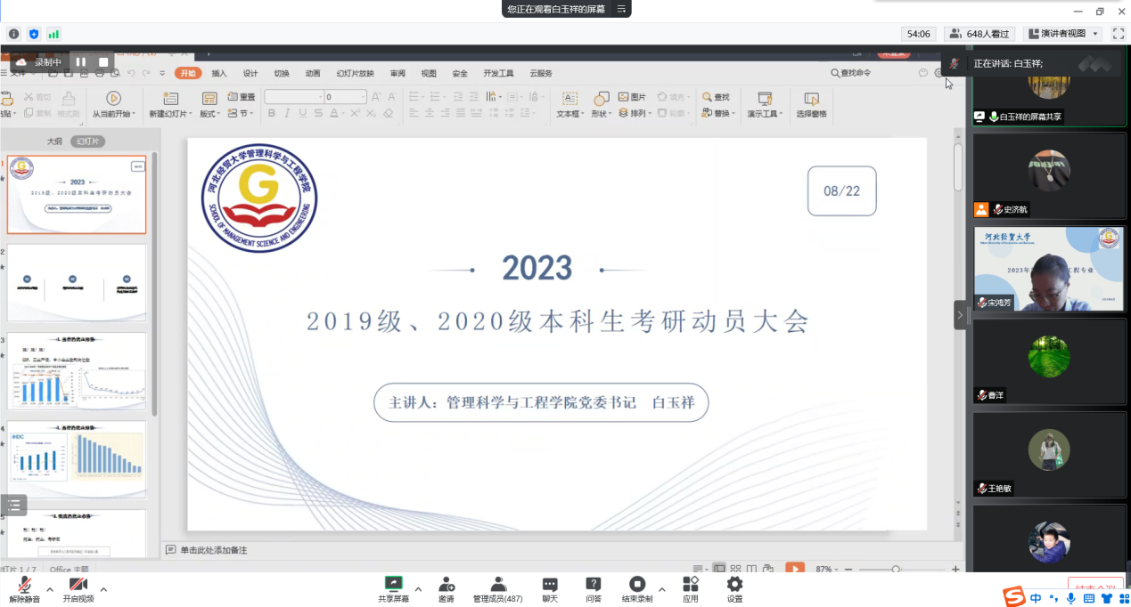 在腾讯会议线上召开2023年度考研动员大会暨研究生招生宣讲会。本次宣讲会由学院党委书记白玉祥和学硕导师组组长宋鸿芳主讲,肉漫屋