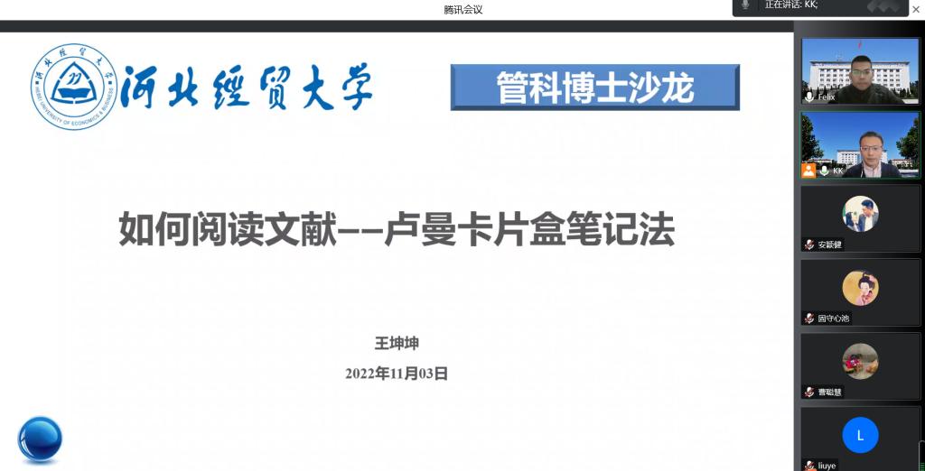 王坤坤博士通过腾讯会议平台做了题为“如何阅读文献——卢曼卡片盒笔记法”的学术讲座。讲座由大数据管理与应用教研室主任张雪峰主持,肉漫屋