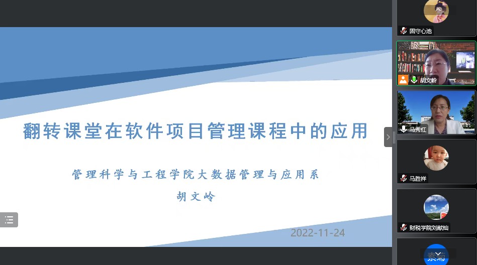 承办的本年度第85期教学沙龙活动顺利举行。大数据管理与应用系副教授胡文岭应邀做“翻转课堂在软件项目管理课程中的应用”交流分享。会议由数管系教研室主任马秀红主持,学院全体教师参加。