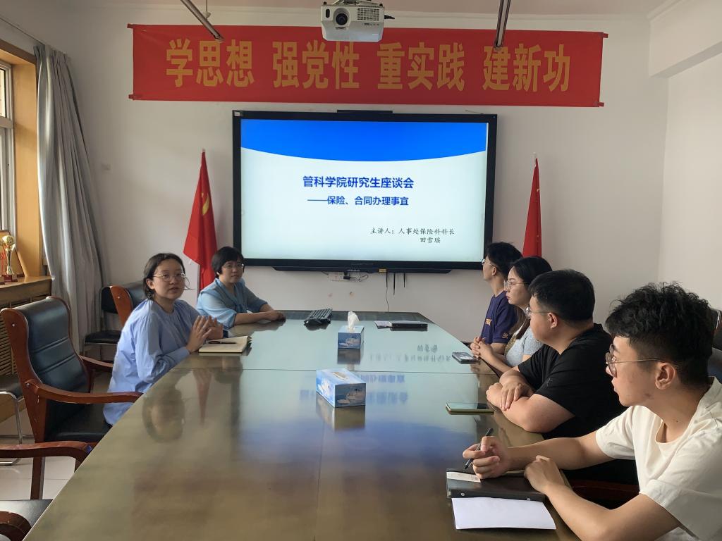 为提升研究生职业规划意识,6月12日,管理科学与工程学院邀请人事处保险科科长田雪瑶举办“保险、合同办理事宜”座谈会。讲座由研究生辅导员曹洋主持,在校研究生参加。