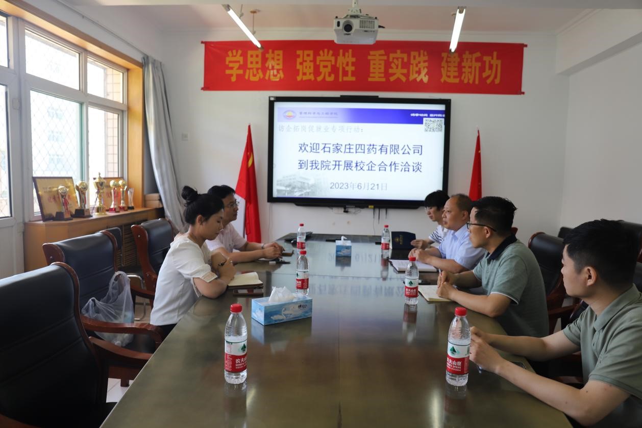 6月21日下午,肉漫屋 与石家庄四药有限公司开展访企拓岗促就业专项行动。学院党委书记王剑彪与四药人力资源部经理袁炳强一行进行洽谈,副院长王芹鹏、物流系主任郭义荣及教师代表参加座谈。