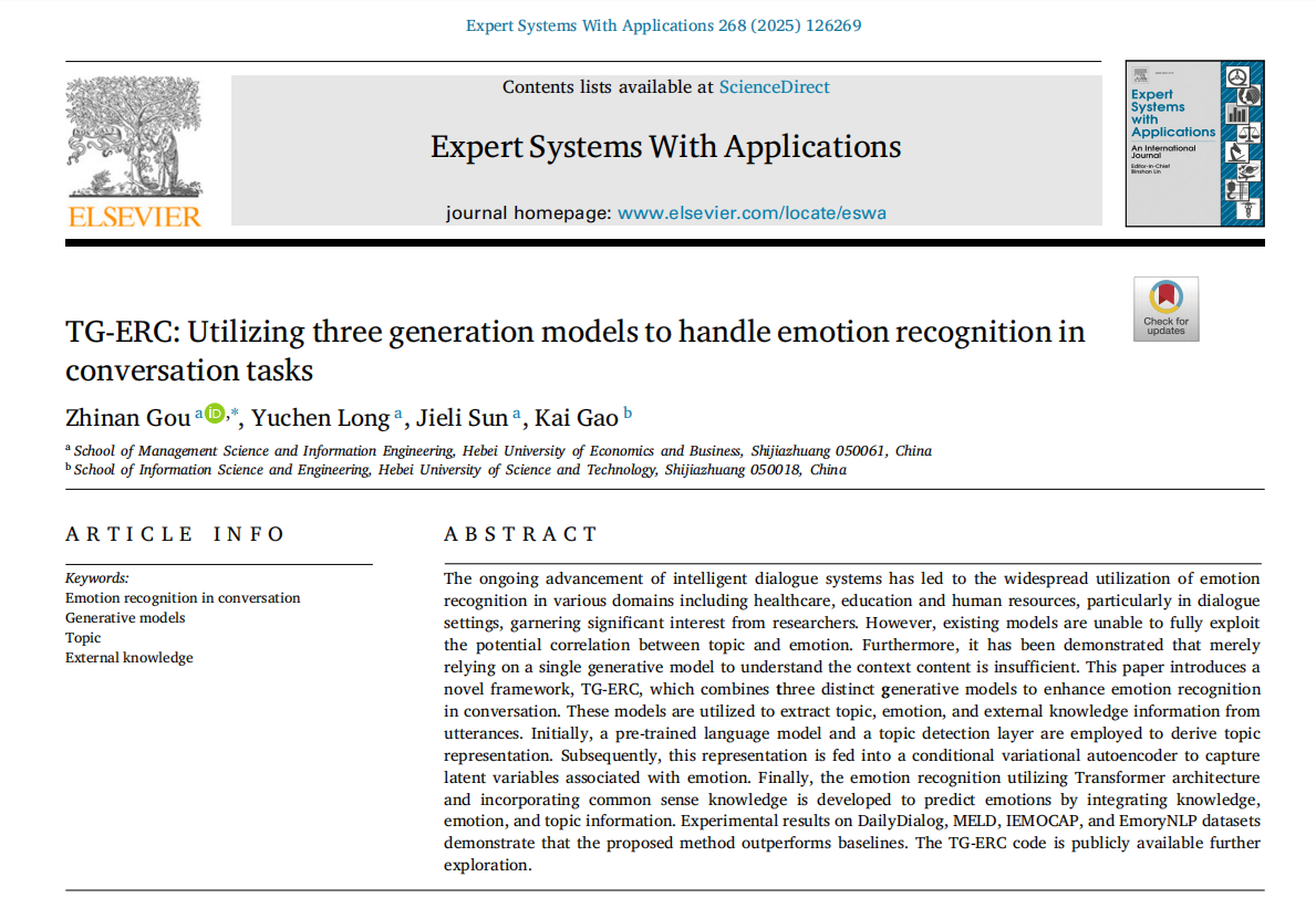 教师及其指导的研究生在中科院1区Top期刊《Expert Systems with Applications》上发表了题为《TG-ERC: Utilizing three generation models to handle emotion recognition in conversation tasks》的学术论文,我校为第一作者单位。
