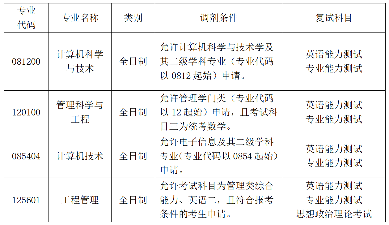 计算机科学与技术(081200)、管理科学与工程硕士(120100)、计算机技术(085404)、工程管理硕士(125601)目前有部分调剂名额,欢迎广大考生积极调剂报考。