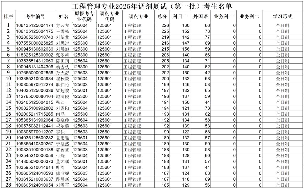工程管理专业2025年调剂复试(第一批)考生名单