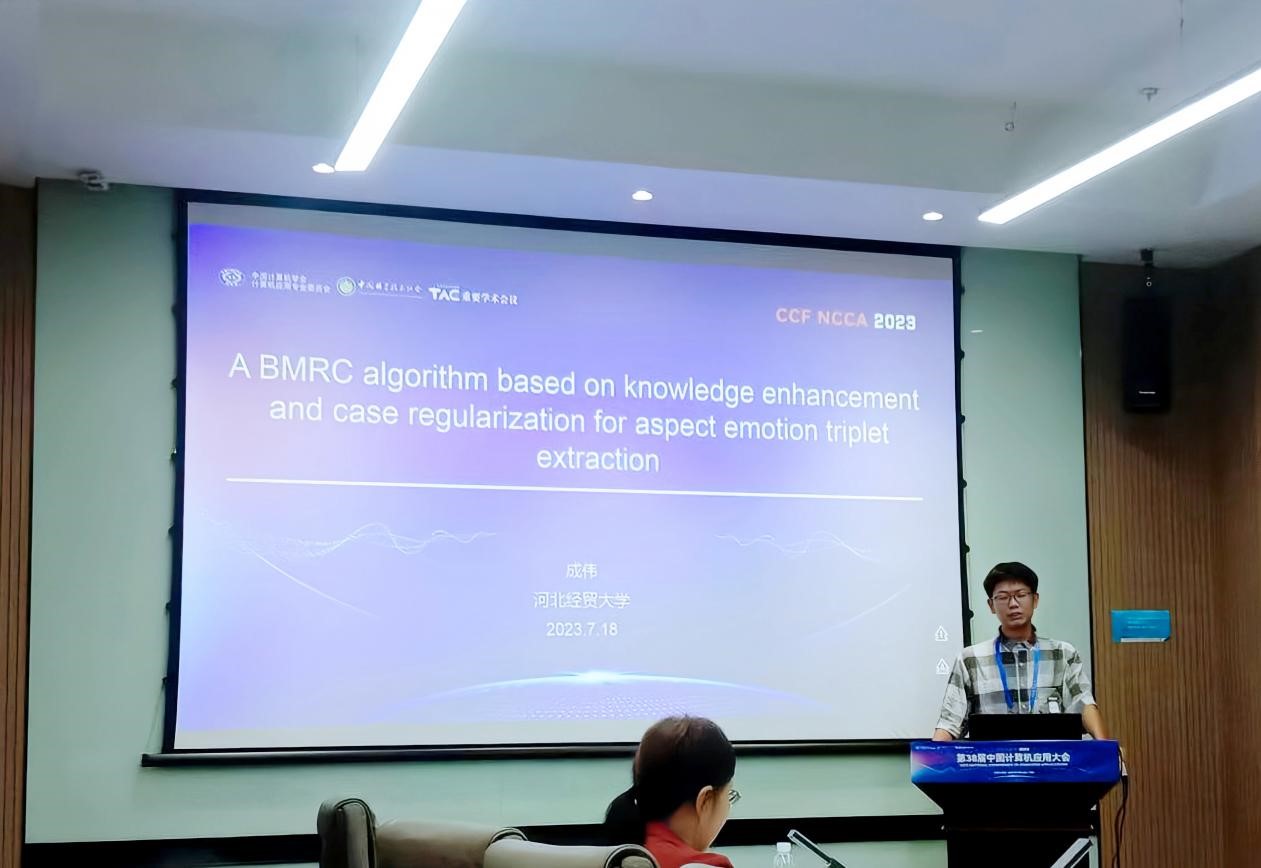 研究生成伟参加了此次会议,作了题为“A BMRC algorithm based on knowledge enhancement and case regularization for aspect emotion triplet extraction”的学术报告,与在场的专家与学者进行了交流与学习。