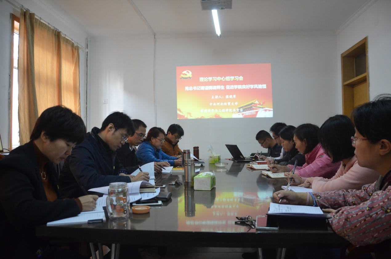 2017年12月4日上午,管理科学与工程学院党委理论学习中心组以学习党的十九大精神加强学风建设为主题开展专题活动。会议由党委书记高永芳主持,学院党委全体成员及系主任、辅导员参加。