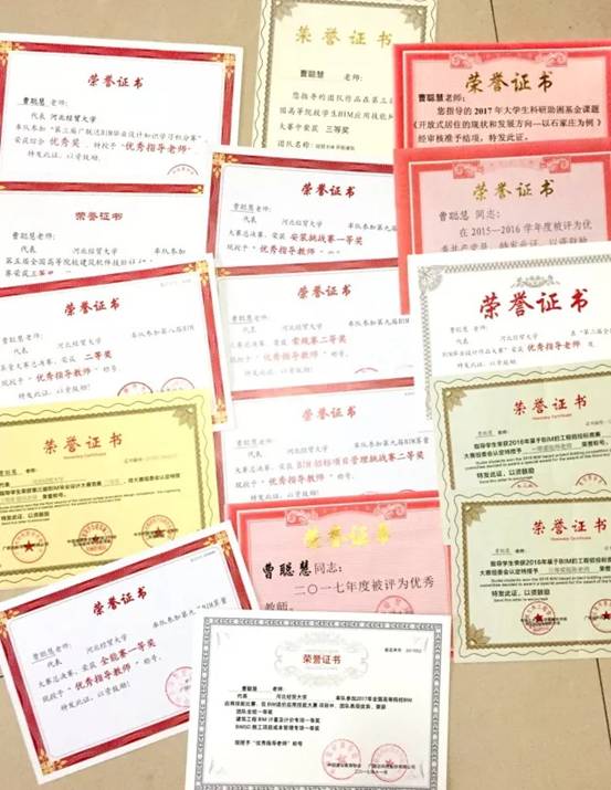 2017年10月指导学生参加全国高等院校BIM应用技能比赛团队全能一等奖,建筑工程BIM计量及计价专项一等奖,BIM5D施工项目成本管理专项一等奖,获得优秀指导教师称号;
