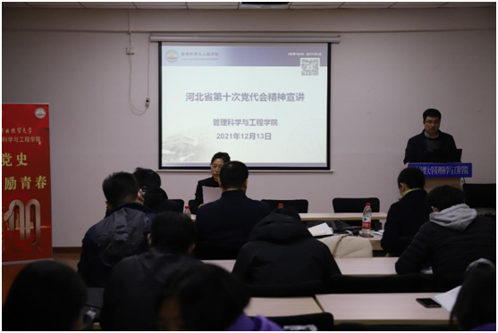 在第一教学楼408教室开展了河北省第十次党代会精神宣讲会。学院党委书记白玉祥、党委副书记李丽、副院长王芹鹏出席,全体教职工参加,学院院长祁红梅主讲。
