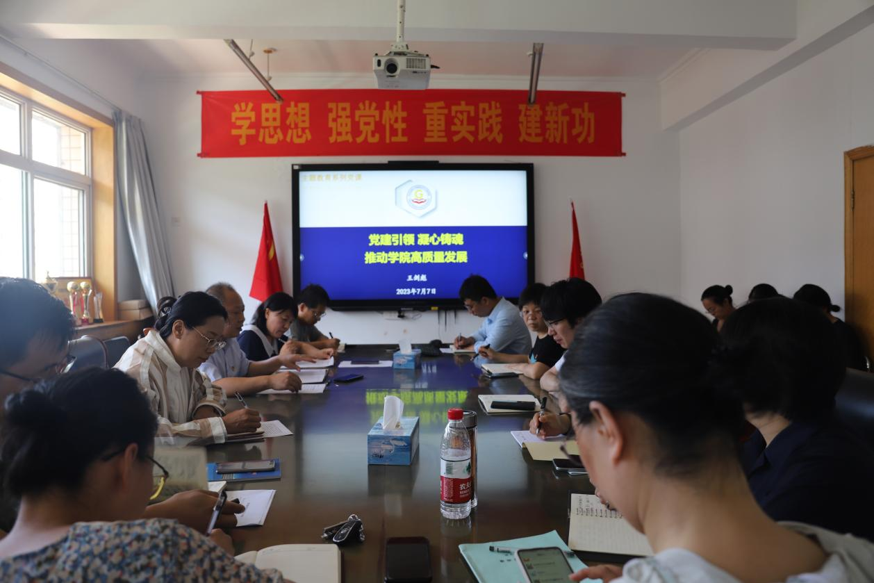 王剑彪以《党建引领凝心铸魂推动学院高质量发展》为题,结合学院主题教育开展情况及个人工作学习体会,从提升党建工作质效、当前学院党建业务融合中存在的问题、下一步工作重点等三个方面进行了讲授。他强调,学院党委和各支部要发挥党建引领作用,全体党员干部要发挥模范带头作用,以主题教育为契机,以学铸魂、以学增智、以学正风、以学促干,以严谨务实的工作作风和争创一流的精神状态,推动学院各项工作提质增效。