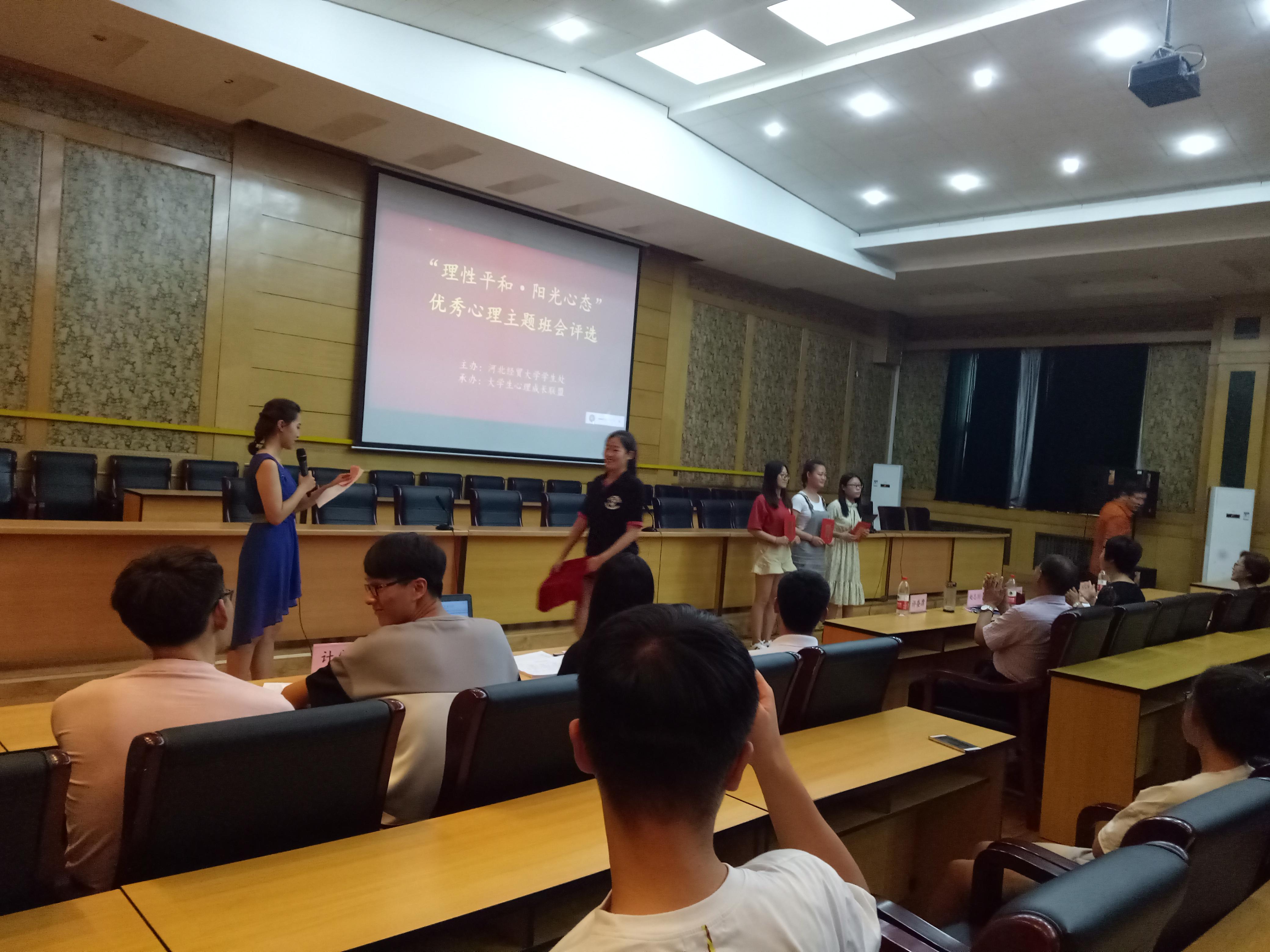 6月5日,下午两点半,由校学生处主办,大学生心理联盟承办的“理性平和,阳光心态”优秀心理主题班会评选活动决赛在会议中心拉开帷幕。管理科学与工程学院由16级物流二班心理委员陈彩云代表学院参赛。