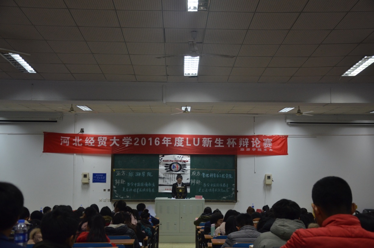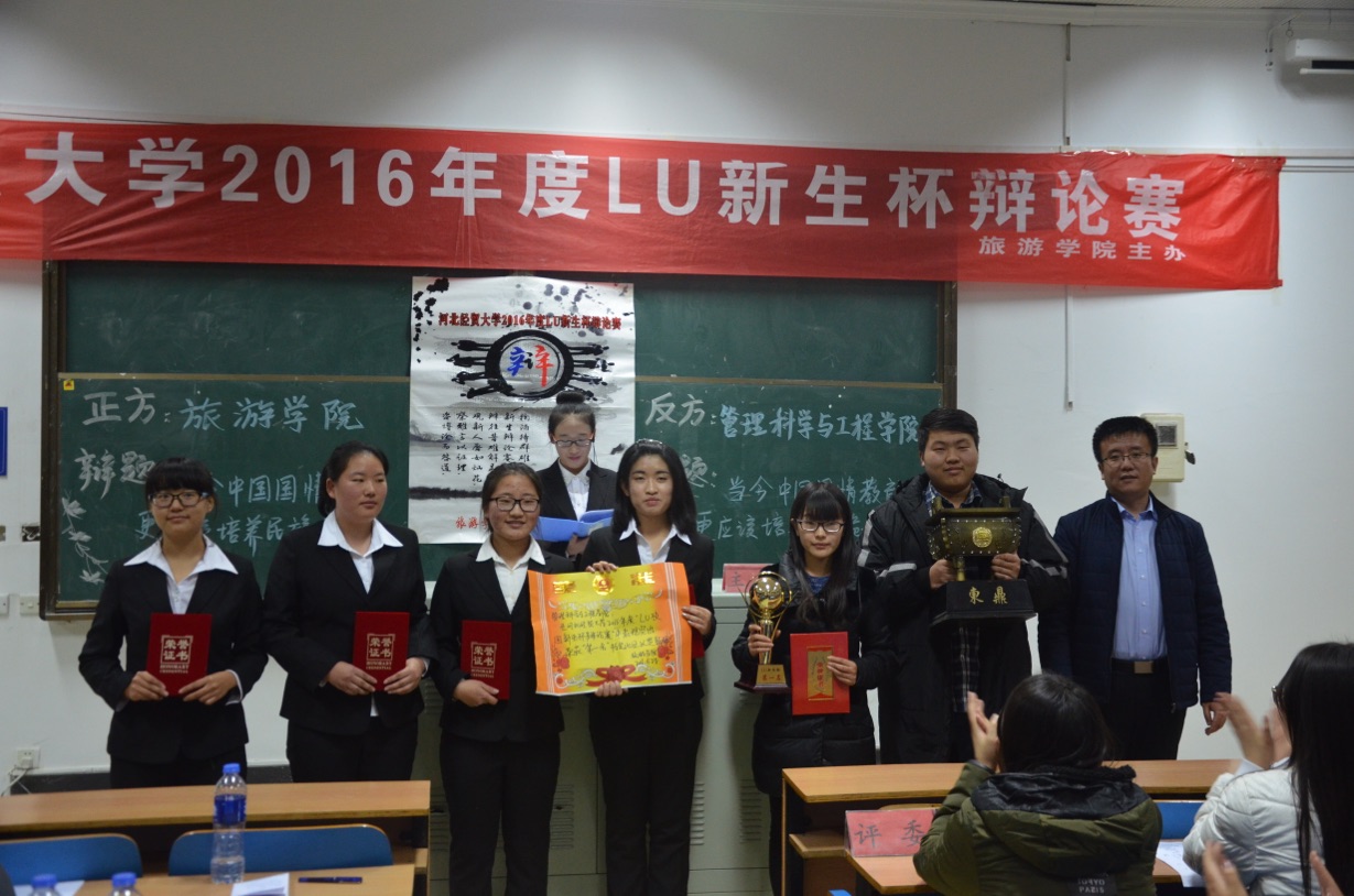 此次比赛旅游学院为正方,持当今中国国情教育更应该培养民族自豪感的观点,学院则持反方当今中国国情教育更应该培养民族危机感的观点。本场辩论赛分为立论、盘问、驳论、攻辩和自由辩五个环节。我方一辩立论清晰,娓娓道来,赢得观众的热烈掌声。接下来的环节我方辩手沉着自信,对答如流,在与对方辩友的激辩当中展现着才华与思考。最终,学院荣获我校2016年度LU新生杯辩论赛第一名,我方四辩牟爽凭借逻辑严密,思路明了获得"最佳辩手"称号。