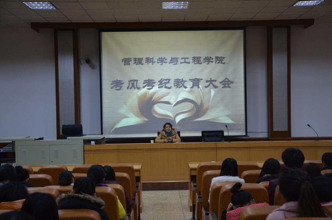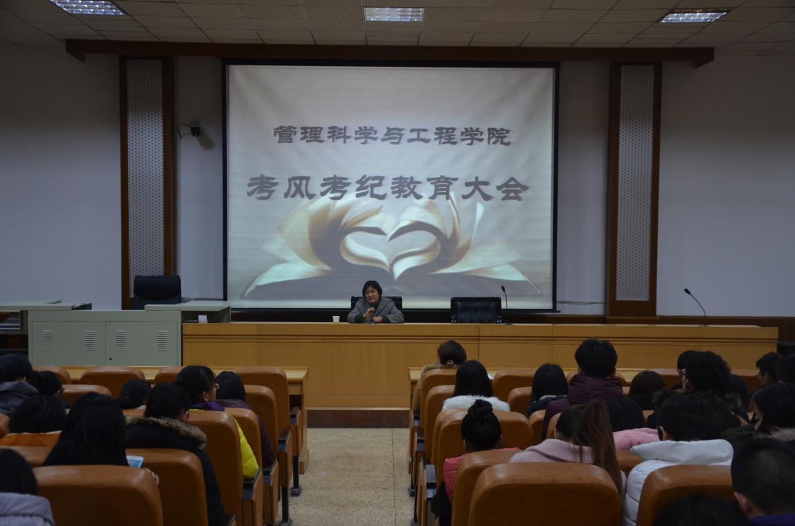 为严肃考风考纪,加强诚信教育,杜绝考试作弊现象,12月29日,管理科学与工程学院于第三教学楼C201教室召开考风考纪教育大会,学院副院长许世瑛、党总支副书记张晓军共同出席此次大会,学院2013、2014级全体学生参加此次大会。