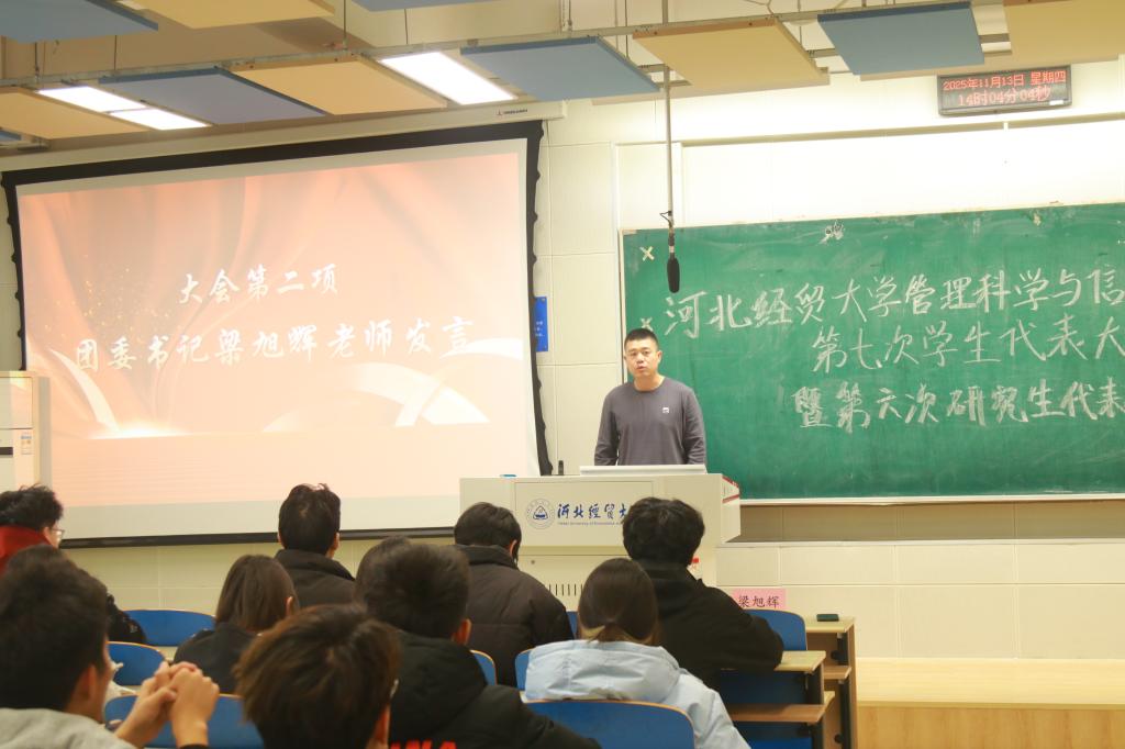 院团委书记梁旭辉老师对大会召开表示热烈祝贺并对上一届学生会的辛勤工作给予高度肯定。他鼓励全学院青年学生和新一届学生会:要坚定理想信念,做志存高远的追梦者;要练就过硬本领,做勤学笃行的实干者;要勇于改革创新,做服务同学的奉献者。希望新一届学生会能继续发挥桥梁纽带作用,团结带领广大同学为学校发展贡献青春智慧。