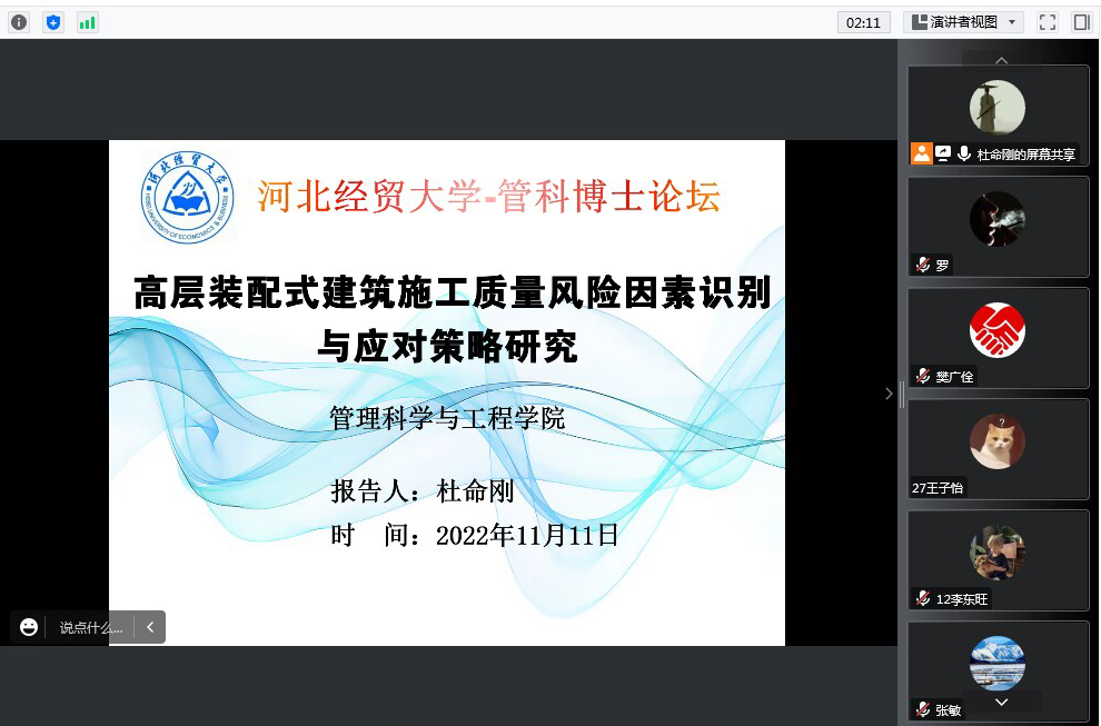 杜命刚博士通过腾讯会议做了题为“高层装配式建筑施工质量风险因素识别与应对策略研究”的学术讲座。讲座由工程管理系主任张敏主持,肉漫屋