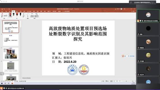 张培兴博士通过腾讯平台做了题为“高放废物地质处置项目预选场址断裂数字识别及其影响范围探究”的学术讲座。讲座由周娜博士主持,学院教师及工程管理专业研究生参加了此次讲座。