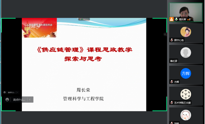 2022年5月9日,由教学评估与教师教学发展中心主办,管理科学与工程学院承办的本年度第26期教学沙龙活动顺利举行。物流管理系周长荣教授应邀做“《供应链管理》课程思政教学探索与思考”交流分享。工商管理学院、计算机中心等近100余名教师参加。