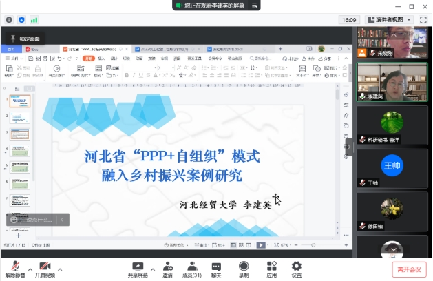 和科研处邀请,我校经济研究所副所长李建英教授在腾讯会议做了题为“河北省‘PPP+自组织’模式融入乡村振兴案例研究”的学术讲座。讲座由院长祁红梅主持,副院长王芹鹏、工程管理系全体教师及2021级工程管理专业研究生共30余人参加。