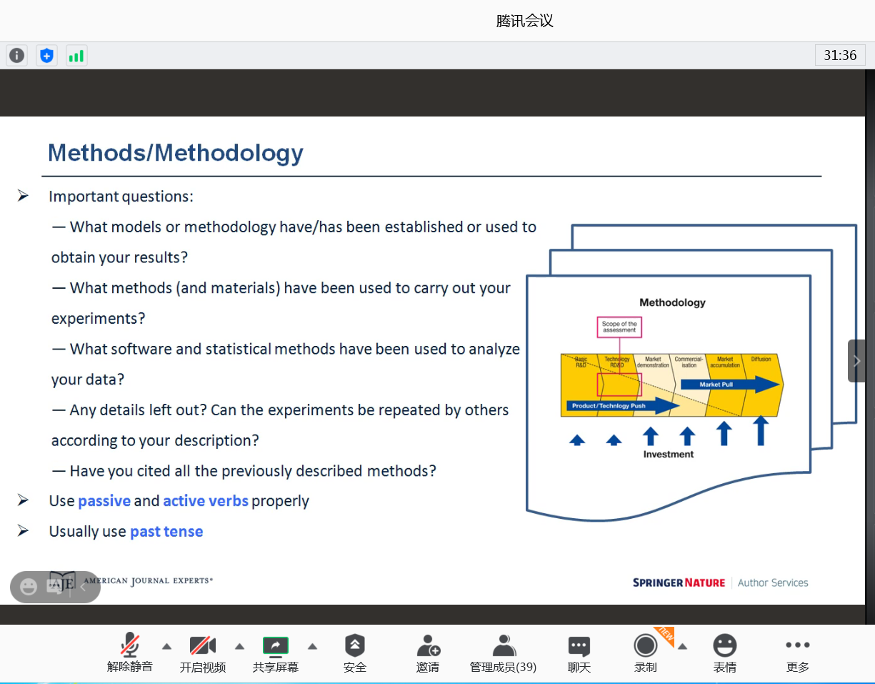 崔韶博士首先向大家讲述了科研论文每部分的写作要点和技巧,特别强调科研论文写作的“ABC”原则和写作过程中图表的正确处理。随后,崔韶博士介绍了在线投稿的相关流程操作、投稿信撰写以及如何回复杂志社来信,使大家对科研论文的投稿流程有了系统的认识。崔韶博士还向大家推荐AJE杂志社专门为肉漫屋