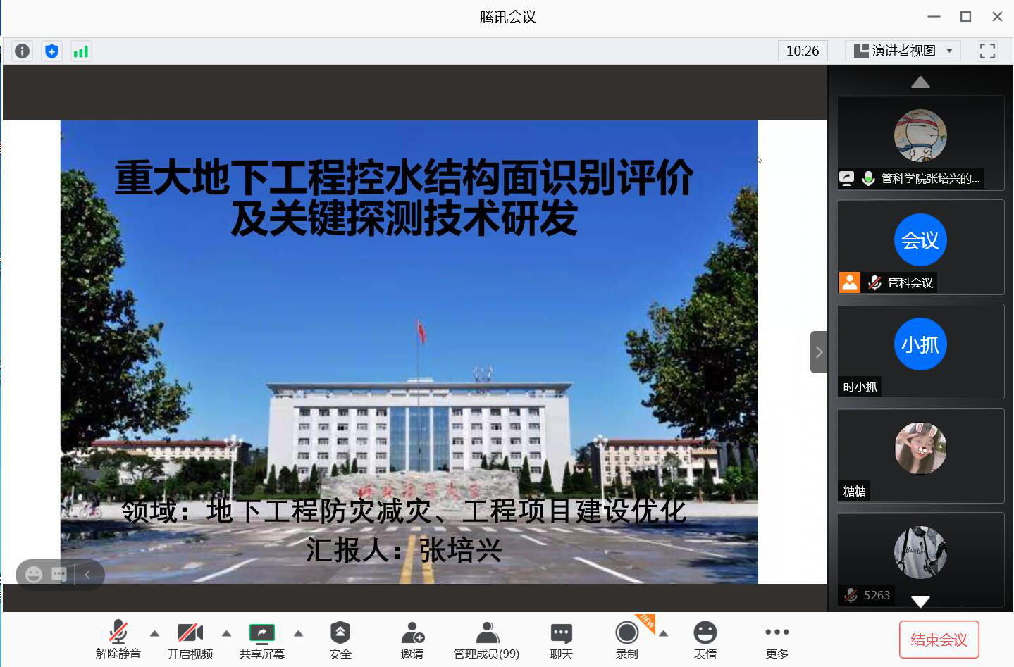 张培兴博士在腾讯平台开展“重大地下工程控水结构面识别评价及关键探测技术研发”学术讲座。讲座由导师组组长宋鸿芳主持,管理科学与工程学院教师、研究生以及部分本科生在线参加了此次讲座。