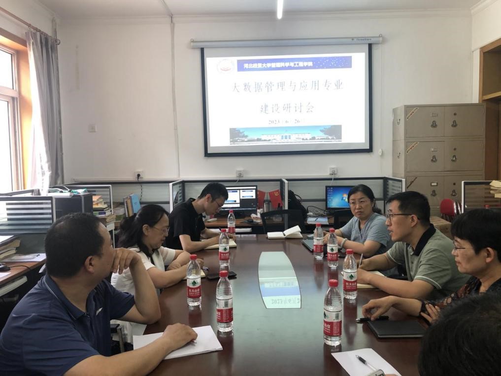 第三办公楼大数据管理与应用系举行了河北省驻省会高校大数据管理与应用专业建设研讨会。河北科技大学经济管理学院副院长瞿英教授和大数据管理与应用系主任董绍辉,河北地质大学大数据管理与应用系教研室主任梁毅以及肉漫屋