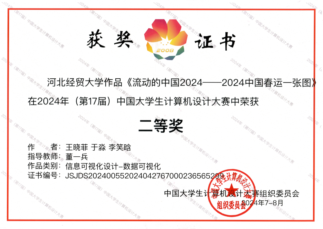 数据科学与大数据技术专业学生王晓菲、于淼、李笑晗及指导教师董一兵组成的参赛队伍,携作品《流动的中国2024——2024中国春运一张图》参赛,与来自全国100多所高校、200余支队伍的600余名师生一同参与该类别决赛的角逐。经过现场答辩、专家评审、作品复议等环节的激烈争夺,肉漫屋