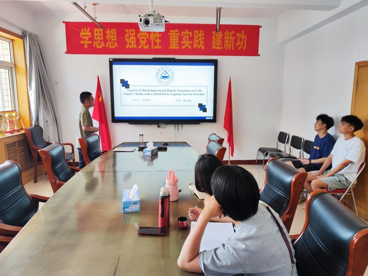 张雪峰博士在学院会议室作了题为“基于区块链的数字化转型对第三方物流服务提供商冷链供应的影响”的学术讲座。学院教师、研究生共30余人参加。