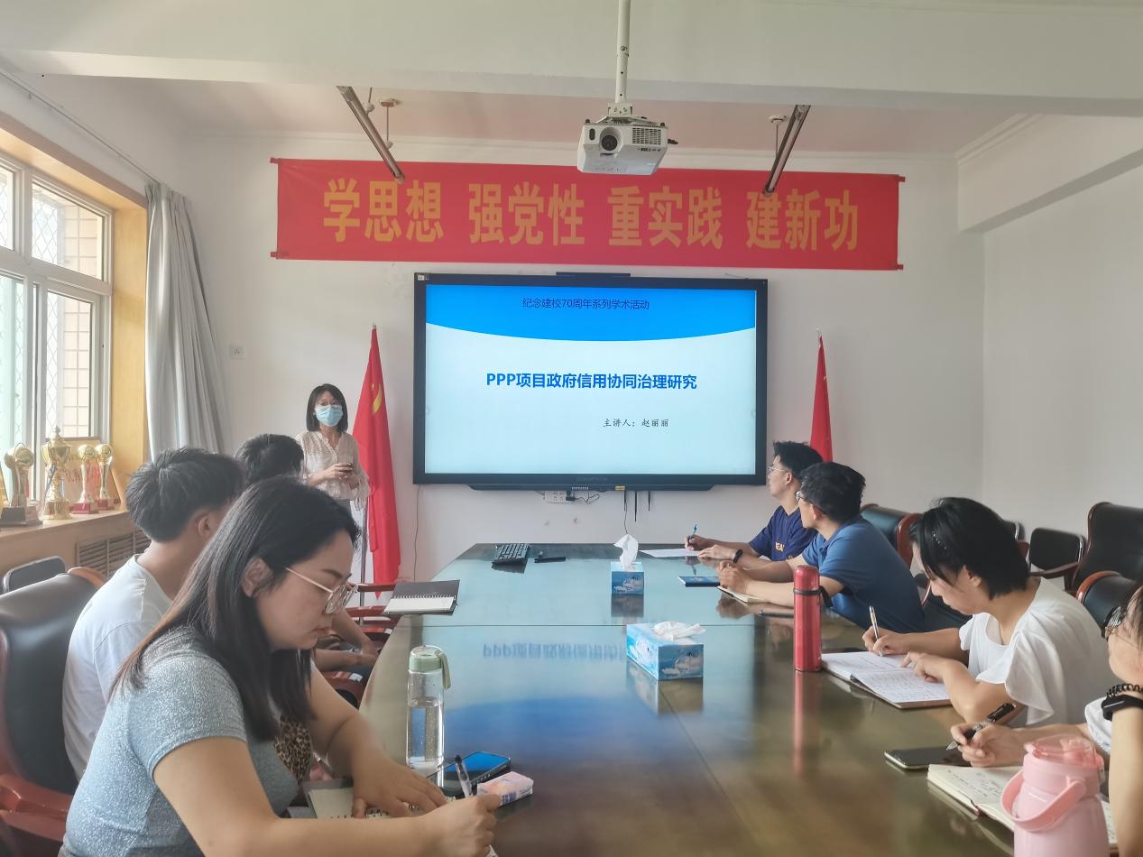 邀请赵丽丽博士作题为“PPP项目政府信用协同治理研究”学术讲座。讲座由副院长王芹鹏主持,学院教师及研究生参加。此活动是“纪念建校70周年系列学术讲座之一”。