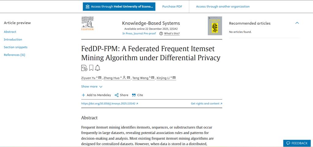 计算机科学与技术专业硕士研究生余紫苑为第一作者、指导教师霍峥为通讯作者在中科院1区top期刊《Knowledge-BasedSystems》上发表了题为《FedDP-FPM:AFederatedFrequentItemsetMiningAlgorithmunderDifferentialPrivacy》的学术论文。