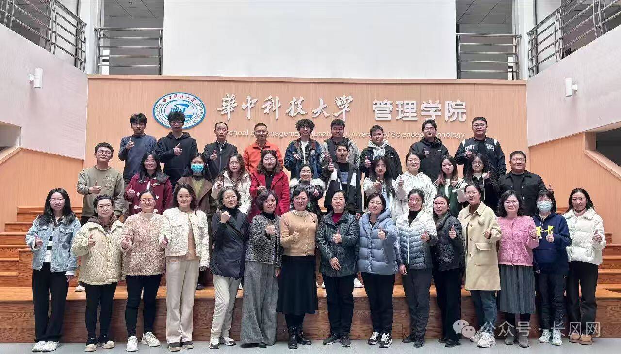 图为2023级MEM研究生李言东(后排右一)在华中科技大学管理学院与参会师生合影